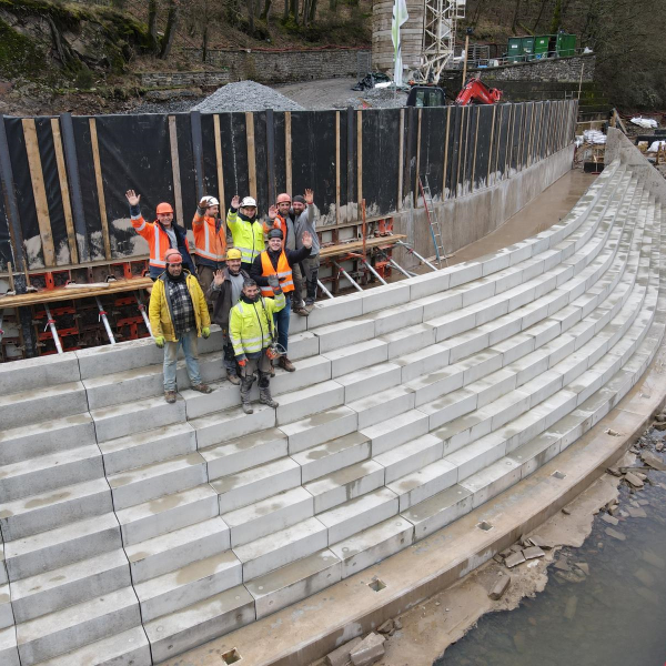 Trotzdem liegen wir gut in der Zeit und konnten die untere Treppenanlage planmäßig fertigstellen - dank der guten Zusammenarbeit mit dem Betreiber des Wasserkraftwerks, unserem Fertigteillieferant, dem Planungsbüro und unserem Bauherrn.